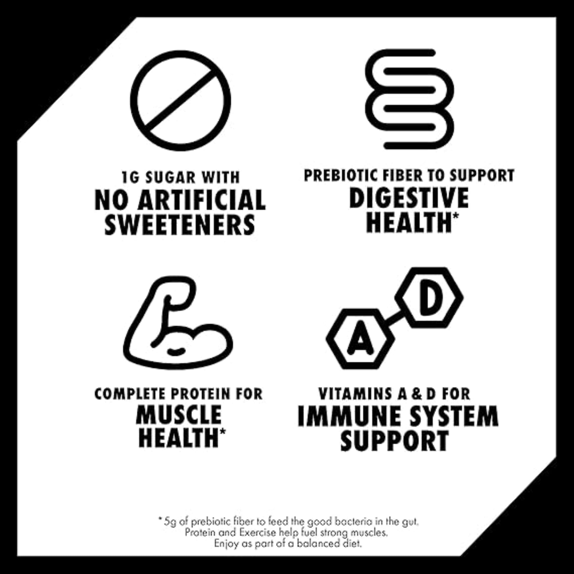 Up your shake game with Oikos Chocolate Protein Shakes. These high protein shakes brings you more of what you want, and less of what you don’t. Every 12 fl oz serving of this chocolate protein shake helps fill your tank with 30g of complete protein for muscle support. Plus, these high protein snacks contain key vitamins A and D for immune system support, along with 5g of prebiotic fiber to support digestive health.* This is chocolate flavor the way you want it with 1g of sugar per serving and no artificial sweeteners. These ready to drink protein shakes are great nutrient dense snacks for any time. Post-workout? Check. Pre-meeting? You know it. On the go? We’re already there. These protein drinks are also shelf stable, so you can up your shake game, no fridge needed. Oikos Protein Shakes are also ready to roll in Salted Caramel and Vanilla protein shake flavors for more protein-packed deliciousness. Oikos — Stronger Makes Everything Better (R). *Prebiotics feed the good bacteria in the gut. Enjoy as part of a balanced diet.